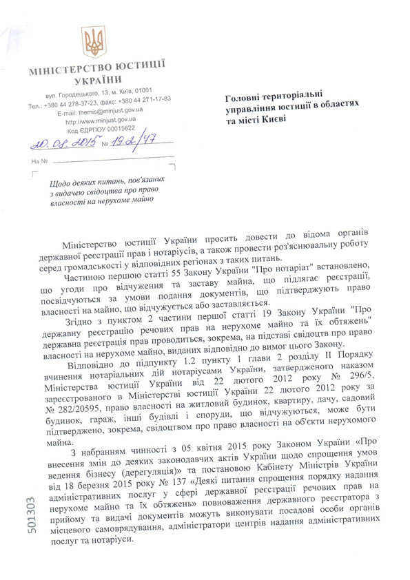 По инициативе рабочей группы «Общественный мониторинг реформ» было затребовано и получено письмо-разъяснение Минюста касательно легитимности свидетельств, которые выдают частные нотариусы на объекты первичной недвижимости (новострои). Необходимость получения такого письма была вызвана тем, что начиная с конца весны частные нотариусы начали принимать документы на регистрацию объектов первичной недвижимости, передавать сканированные документы государственным регистраторам и, в случае положительного решения о регистрации, выдавать свидетельства о праве собственности с извлечением из реестра. Таким образам нотариусы начали по сути выполнять функции «фронт офиса» при регистрации. Такое нововведение в первую очередь значительно упростило жизнь застройщикам многоквартирных домов и ускорило получение свидетельств для собственников.