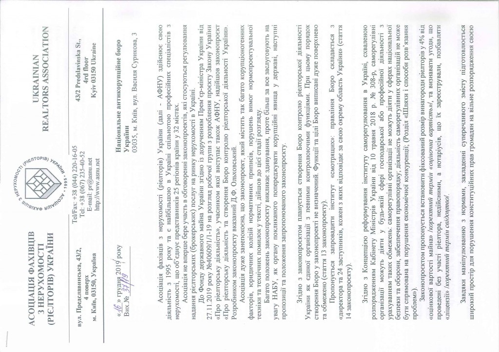 Асоціація фахівців з нерухомості (рієлторів) України підготувала та направила до Національного антикорупційного бюро України заяву про попередження створення корупційної схеми в сфері регулювання рієлторської діяльності.