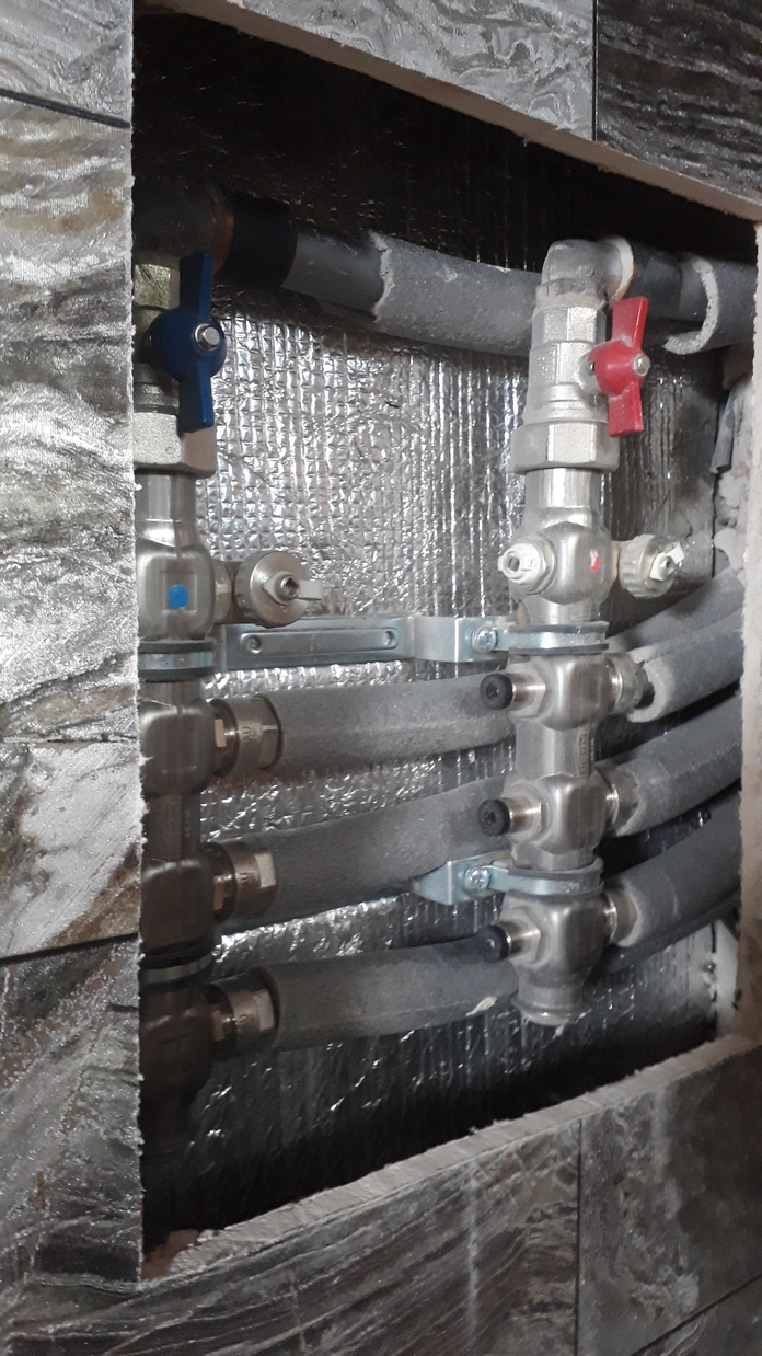 Первое и самое впечатляющее- идеально с умом выполнены черновые работы. Для разводки отопления и воды использовались трубы REHAU со сроком службы до 100 лет с помощью итальянского коллектора без швов по разводке. Вы застрахованы от любых сюрпризов с трубами.