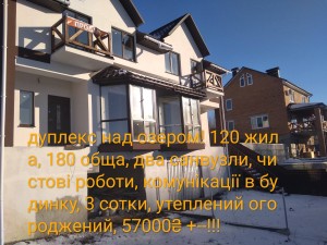 Дуплекс над озером.Великий просторий утеплений будинок, панорамні вікна, гараж на 2 авто котельна кладова, утеплений огороджений.