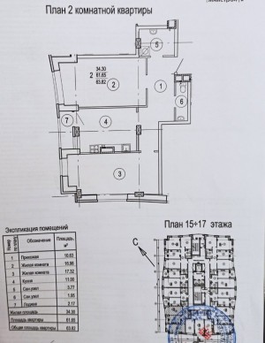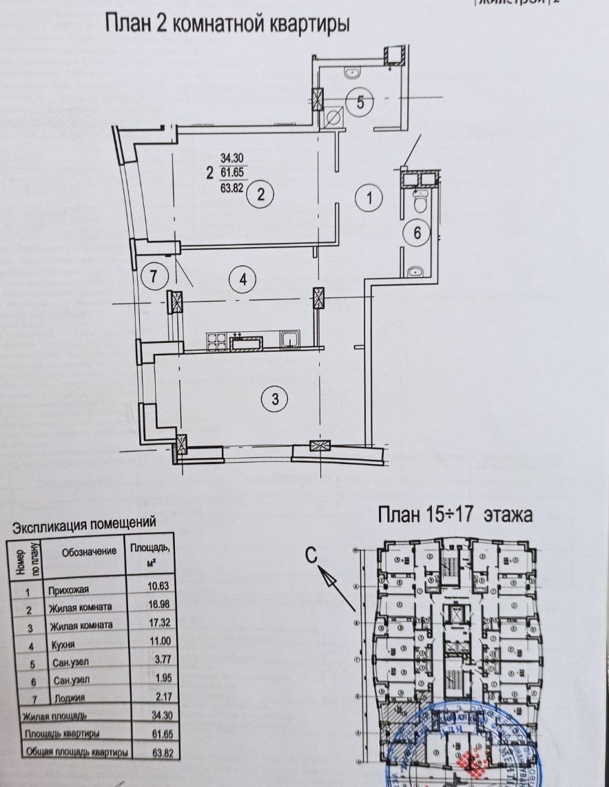Общая площадь 63,82 кв.м: кухня 11 кв. м, две отдельные комнаты, два санузла, прихожая.
