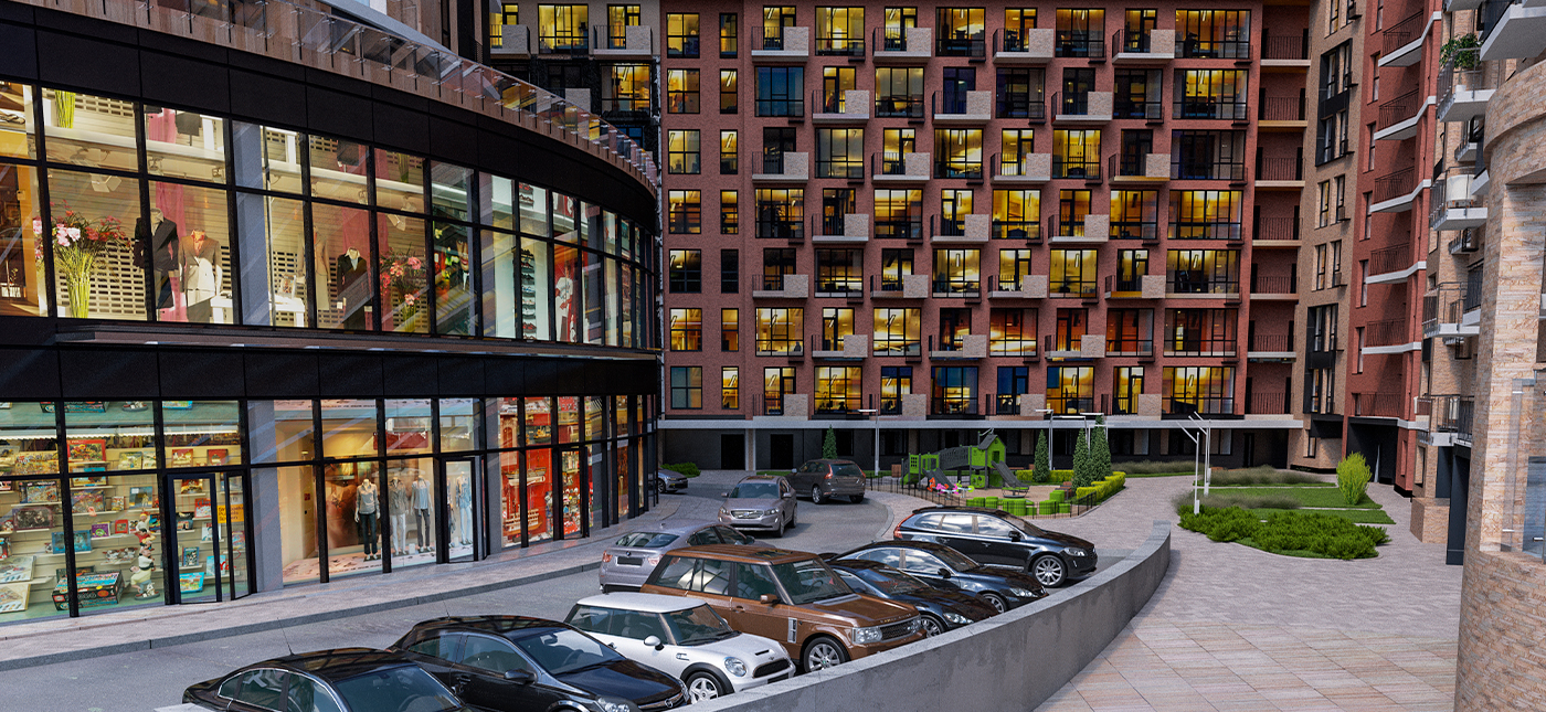 В комплексе предусмотрен пятиуровневый паркинг с электрозарядными станциями.