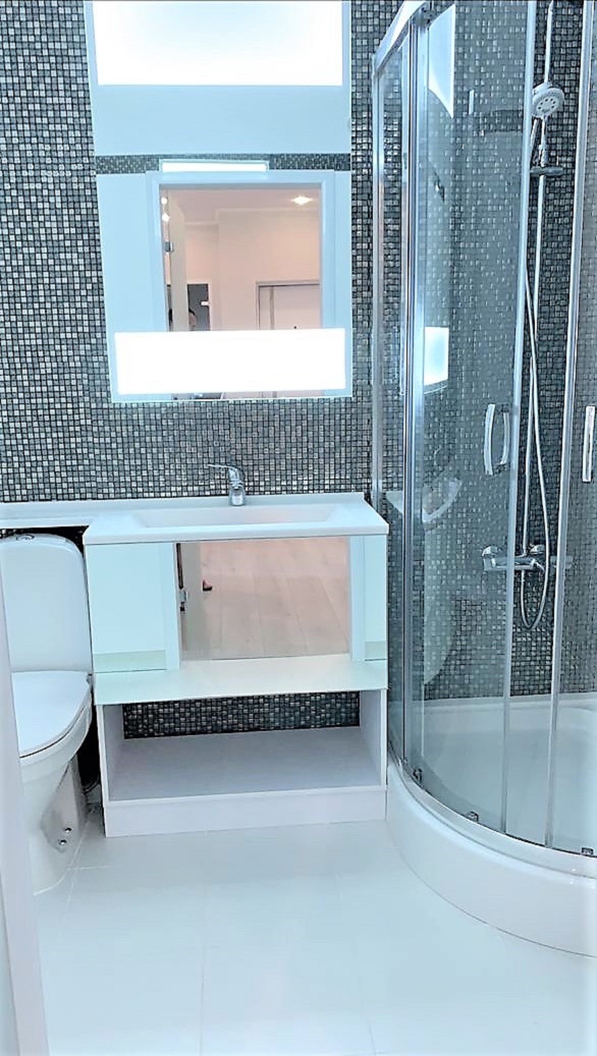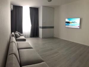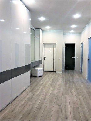 Загальна площа - 110 кв.м: кухня-вітальня, три спальні, два санвузли, вбиральня, балкон.